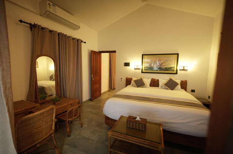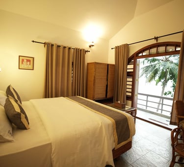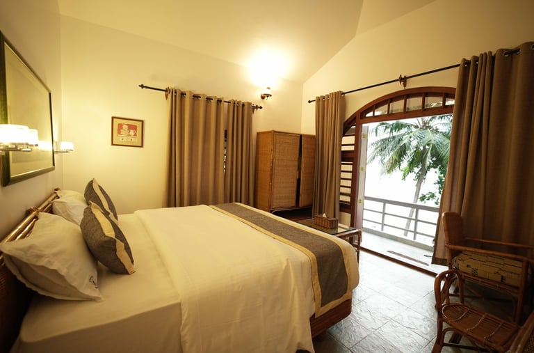 Relax in rooms where sea breeze meets warm Malabar charm.